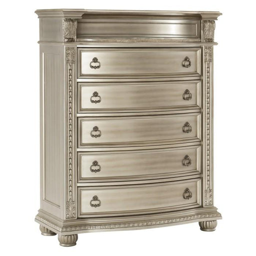 Celandine Collection by Homelegance Silver finish Made of manmade wood 6 Drawers Dovetail drawers Embossed drawer front panel Ball bearing glides ...