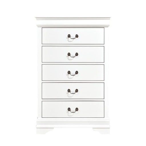 Mayville Collection by Homelegance Furniture White finish 5 Drawers Antiqued metal bale hardware Distinct framing 31.5 x 16 x 48.5H