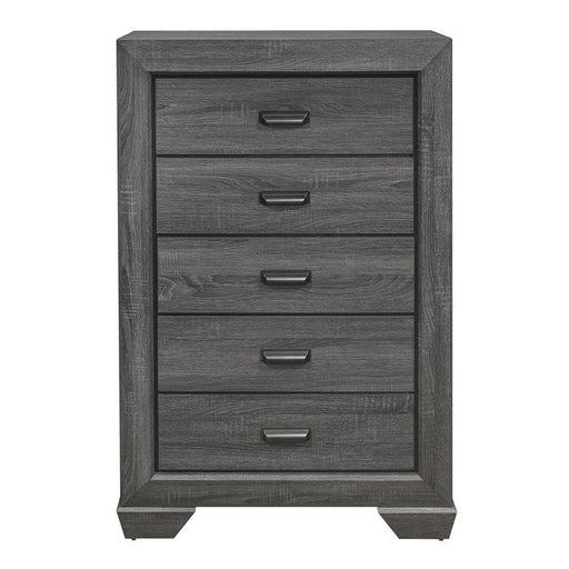 Beechnut Collection by Homelegance Furniture Gray finish Dark under-panelling 5 Drawers Embossed faux wood Contrasting cup hardware 33 x 16.5 x 50H