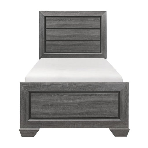 Beechnut Collection by Homelegance Furniture Gray finish Dark under-panelling Embossed faux wood This bed requires a boxspring 41.75 x 80.25 x 53.5H
