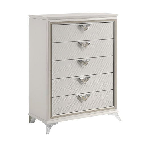 The epitome of fashion-forward design, this chest of drawers is a beautiful blend of style and luxury. Shiny chrome-tone accents, a pearlized finis...