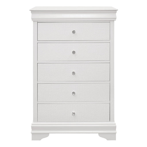 The unexpected intersection of traditional design and glamorous styling creates the dynamic look of the Lana Collection. A white finish is utilized to enhance the faux alligator embossed drawer fronts of the chest with crystal faceted knob hardware lending an additional fabulous touch. The chest features hidden storage allowing for the discrete placement of your personal affects. 32 x 17.5 x 47.5H