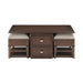 The versatile design of the Claremore Collection is a unique blend of function and form, creating a classic occasional table group for your home’s living room. Serving as both seating and tabletop, the cocktail table’s top and drawer storage base serve as shelter for a pair of storage ottomans. The nailhead-trimmed padded seats of the ottomans tuck neatly beneath the table’s top to provide convenient seating, open display, and discrete lifted-seat storage. The collection’s birch veneer is finished in brown as a neutral complement to your living room’s décor. Cocktail Table: 48 x 28 x 20H, Ottoman: 27 x 15.5 x 18H