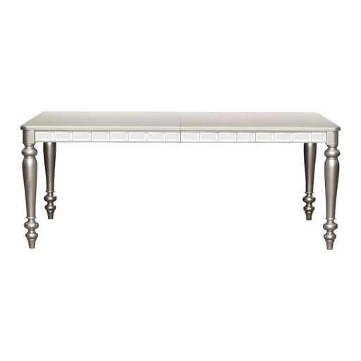 Orsina Collection by Homelegance Silver finish Made of Manmade wood, mirror and wood Separate extension leaf Table extends by pulling both ends an...