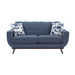 Mid-Century Modern inspired design comprises the timeless look of the Everton Collection. Blue chenille covers the modern framed love seat with geometric print toss pillows, walnut-finished wood base rail and legs providing complementing accent to the group. Contour stitching lends scalloped detail to the seatback’s profile, and front, while the prominent framing of the collection’s arms solidifies the retro-inspired form. The collection also features reversible seat cushions. 70 x 35 x 37H