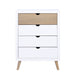 Providing the perfect landing pad for your child’s bedroom, the Asker Collection is a fun and functional addition to their space. The two-tone white and natural finish of the pine veneer is paired with the mid-century modern design to create a classic profile. The chest features a neutral finish on the top drawer, with white fronts on the bottom drawers. Grooved hand openings center each drawer front serving as an easy access point for drawer extension. 30 x 16.5 x 40H